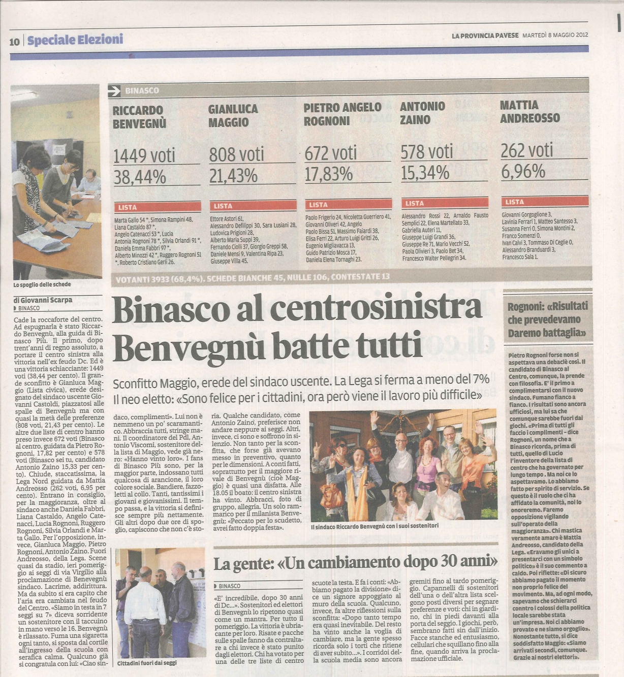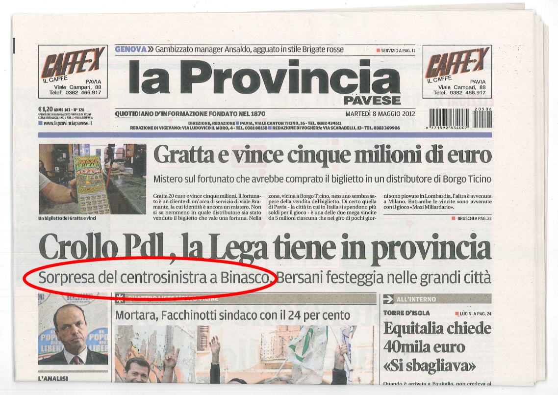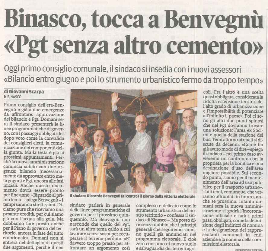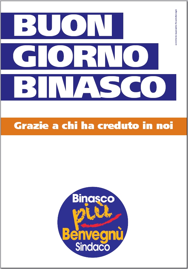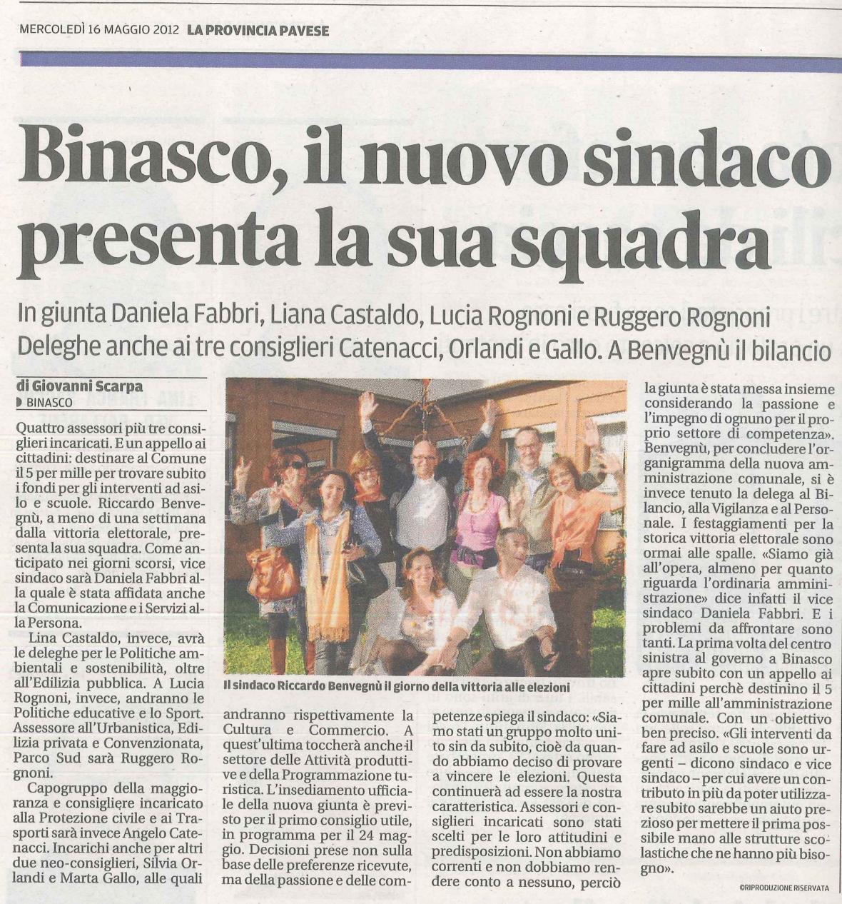 In questo difficile contesto noi assumiamo oggi la guida del Comune di Binasco, con una prima bruciante scadenza da rispettare: l’approvazione del bilancio preventivo entro il 30 giugno 2012. I saldi comunicatici al passaggio di consegne ci dicono che dovremo recuperare 290.000 eur per coprire la spesa corrente, 300.000 eur per rientrare nei parametri previsti dal patto di stabilità cui si aggiungano 360.000 eur di fatture impagate a far data dal 2010.
