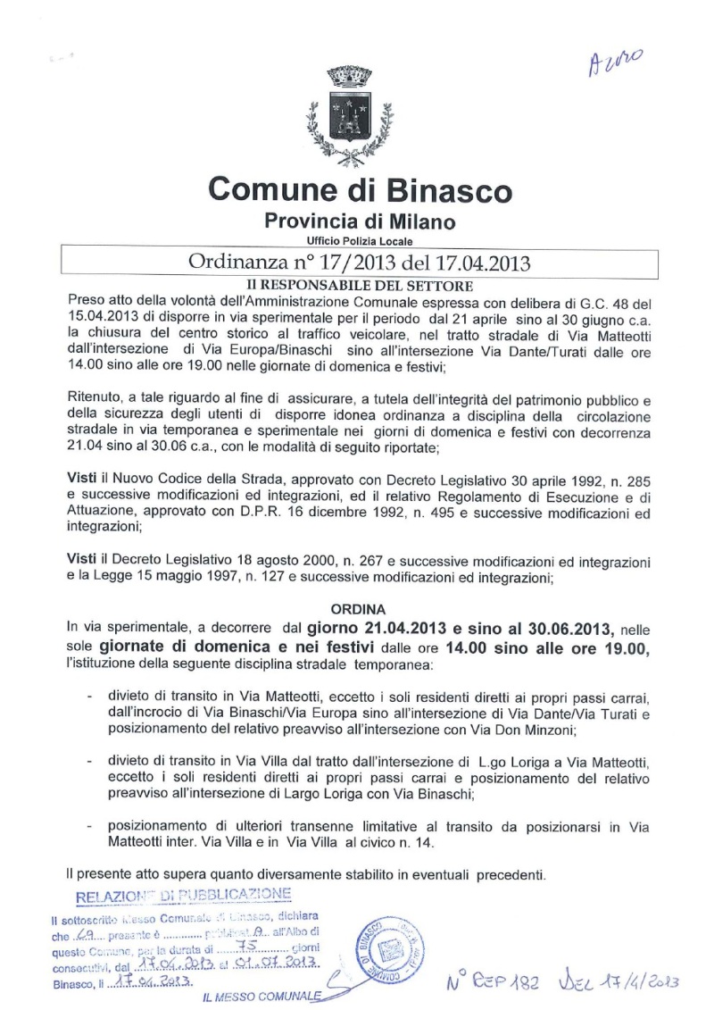 l’ordinanza di chiusura al traffico del centro storico nei giorni di domenica e festivi dalle 14 alle 19.