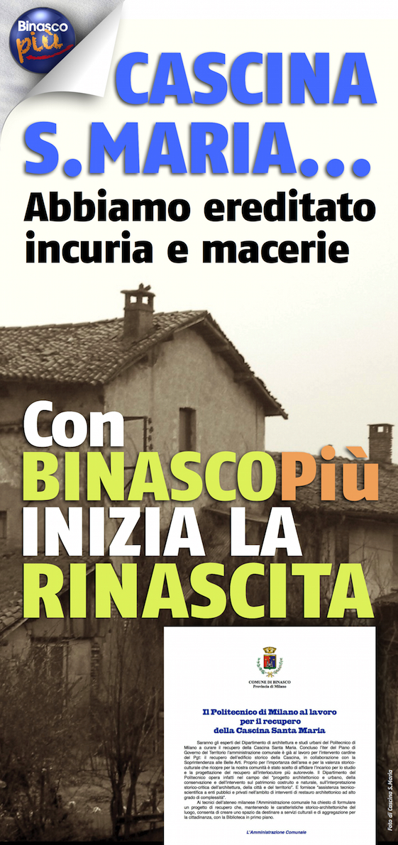 Con l’affidamento dell’incarico al Politecnico di Milano di formulare un progetto di recupero di Cascina Santa Maria (Cascina del Ferro) che risponda a requisiti di conservazione storico-architettonica e destinazione ad uso pubblico, la giunta Binasco PIU’ ha fatto il primo passo per fermarne il degrado provocato dal totale disintinteresse dei decenni precedenti.