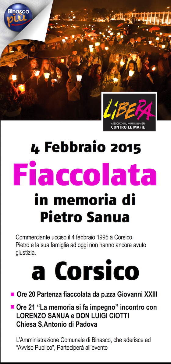Il 4 febbraio prossimo l’associazione Libera ha organizzato a Corsico una fiaccolata in memoria di Pietro Sanua.