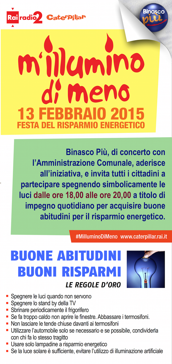 Nel prossimo fine settimana Binasco Più sarà presente di fronte al castello con un gazebo per promuovere “M’illumino di meno” edizione 2015. Passate a trovarci e riceverete un oggetto utile all’iniziativa